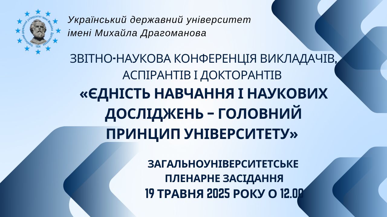 Шановні драгоманівці! З 19 по 23 травня 2025 року в Українському державному університеті імені Михайла Драгоманова проходитиме звітно-наукова конференція викладачів, аспірантів і докторантів університету за підсумками наукових досліджень 2024 року «Єдність навчання і наукових досліджень – головний принцип університету».