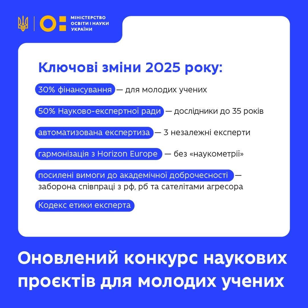 Міністерство освіти і науки України розпочинає прийом заявок на конкурс наукових проєктів для молодих учених у 2025 році. Цьогорічний конкурс вирізняється низкою важливих оновлень, що відкривають нові можливості для амбітних ідей та дослідницьких проривів.