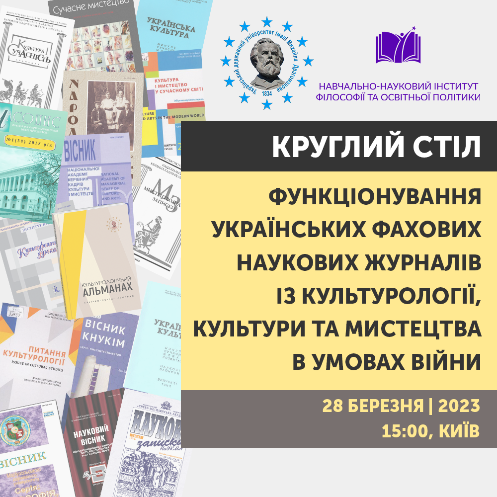28 березня 2023 року о 15:00 в Науковій бібліотеці Українського державного університету імені Михайла Драгоманова відбудеться круглий стіл «Функціонування українських фахових наукових журналів із культурології, культури та мистецтва в умовах війни», який організовує Навчально-науковий інститут філософії та освітньої політики.