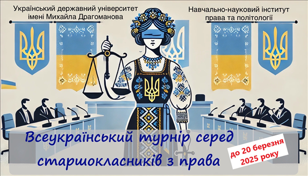 Навчально-науковий інститут права та політології УДУ імені Михайла Драгоманова у березні-квітні 2025 року проводить Всеукраїнський турнір серед старшокласників з права (далі – Турнір)..
