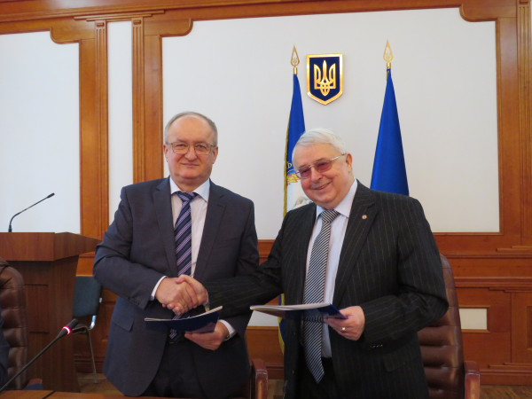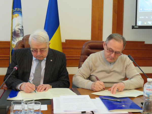 Ректор УДУ імені Михайла Драгоманова Віктор Андрущенко та директор Інституту Олег Рафальський урочисто підписали документ на засіданні Вченої ради університету.