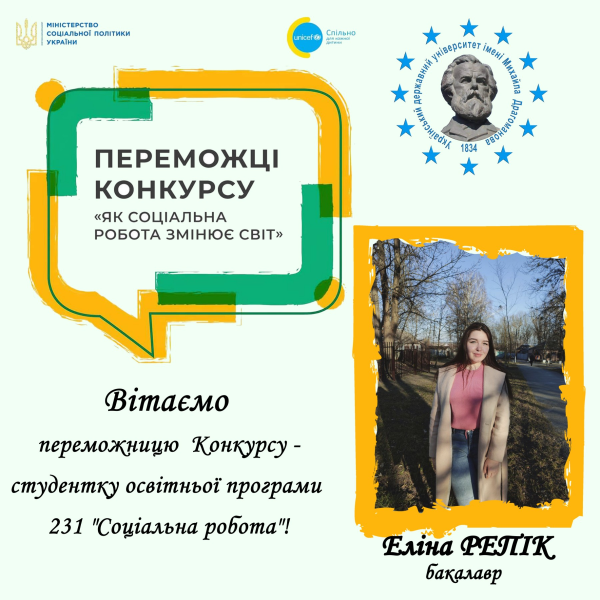 Одна з кращих студенток УДУ імені Михайла Драгоманова Еліна Репік, майбутня фахівчиня соціальної сфери, яка навчається на 3 році навчання за ОП «Соціальна робота», увійшла в ТОП-20 найкращих серед 100 учасників конкурсу «Як соціальна робота змінює світ», організований Міністерством соціальної політики України до Всесвітнього дня соціальної роботи.